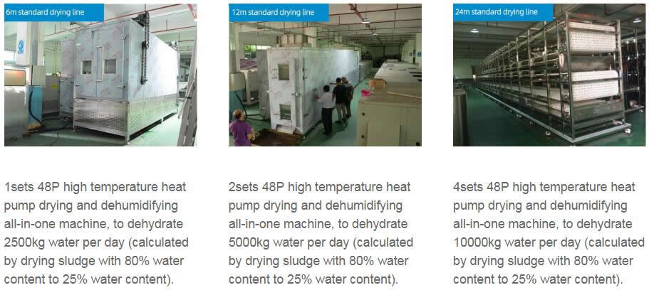 The standard drying line is 6 meters. Now we take a example of 24 meters modular system design, high temperature drying, efficient dehumidification and conveyor belt material transport mode, not only can batch uninterrupted material transport to the drying line, achieve mass production, multi-layer conveyor belt and back transport mode, but also can play the role of turning over materials in the transportation process, greatly increasing the contact area and contact time between materials and hot air. The drying speed is fast, and drying and dehumidification effect are good. The whole system is enclosed in circulation, free of dust and particulate matter pollution to the atmosphere. The system is equipped with high-voltage electric field sterilization. The daily sludge treatment is about 13 tons (according to different requirements for sludge dewatering), covering a small area, suitable for large and medium-sized industrial sludge treatment.